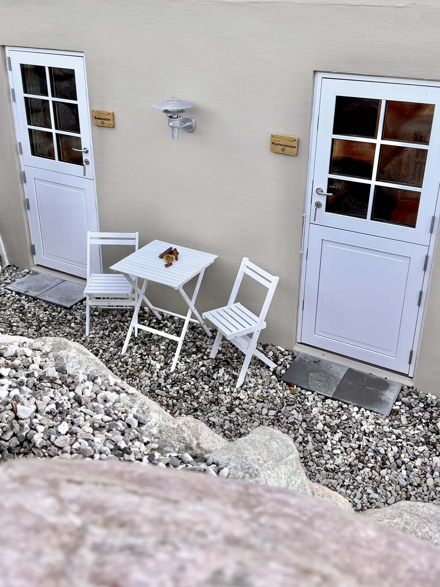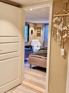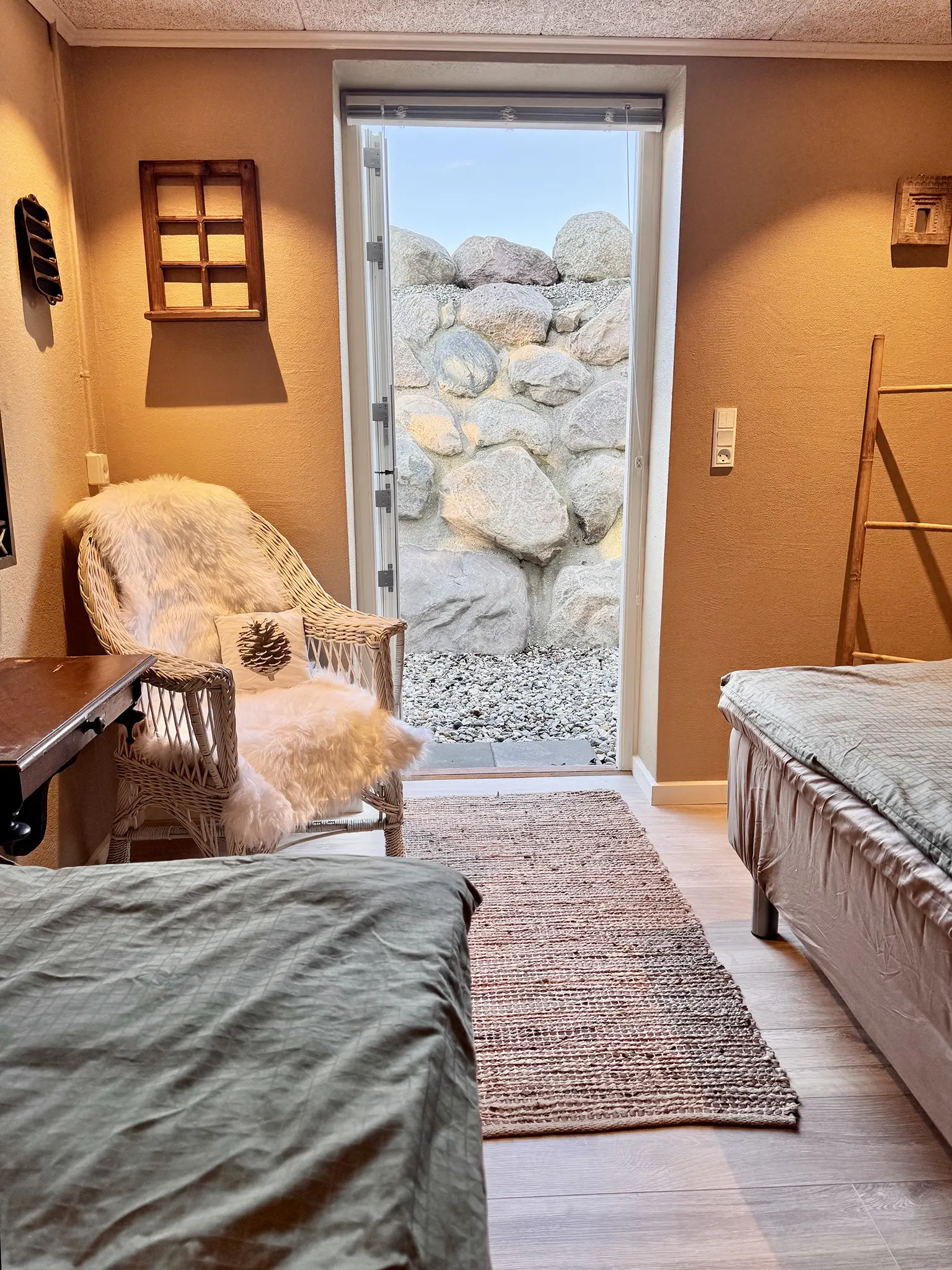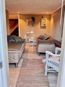 PusteRummet er et varmt og roligt værelse, skabt til pauser og nærvær. Her venter to blød seng, rolige rammer og en atmosfære, der inviterer til at trække vejret lidt dybere. Du kan lægge dagen bag dig, lukke døren – og lade stilheden tage over.
