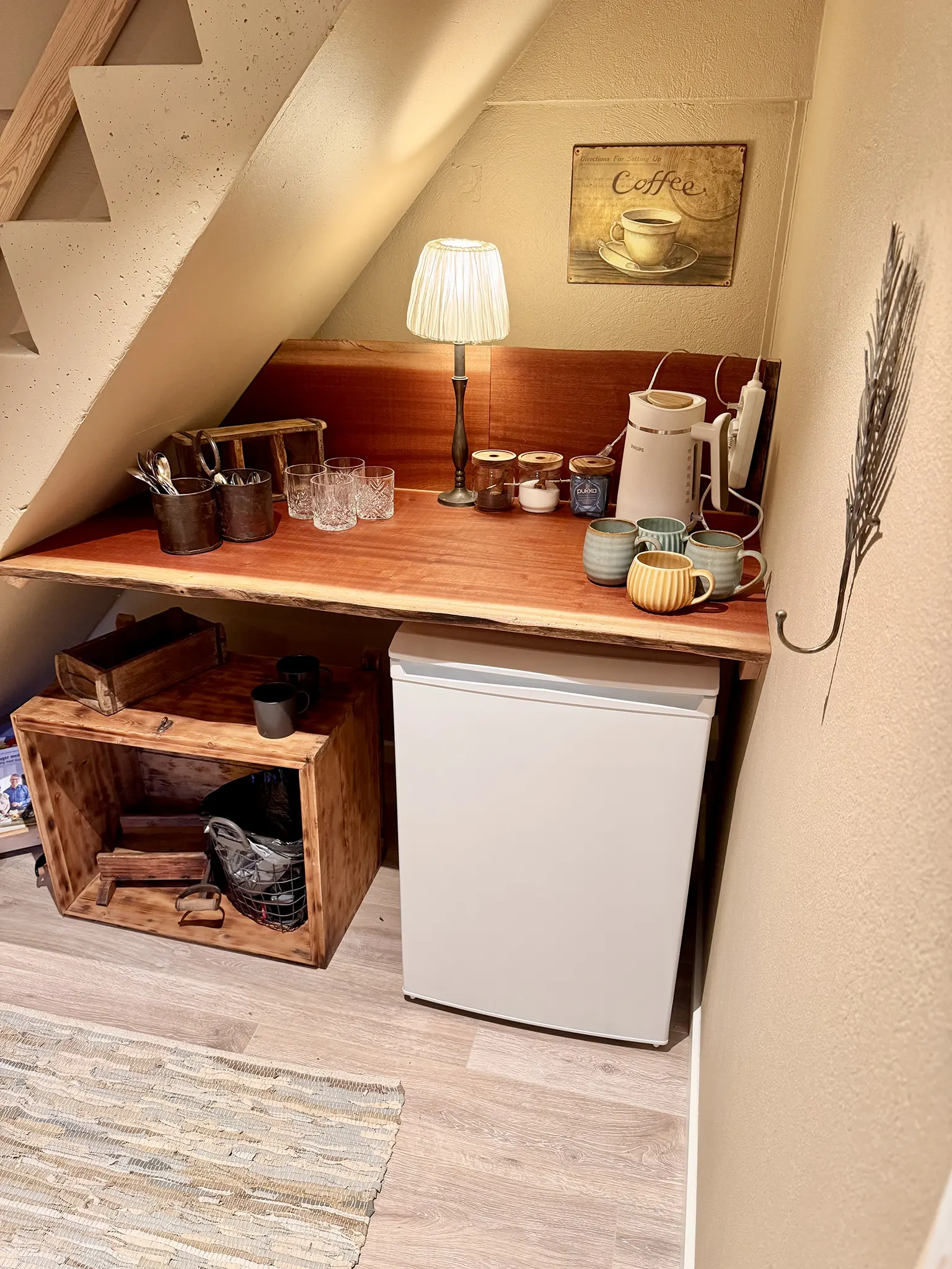 Der er et tekøkken med køleskab og kaffe, the og vand ad libitum – tekøkkenet deles med ÅNDEHULLET.