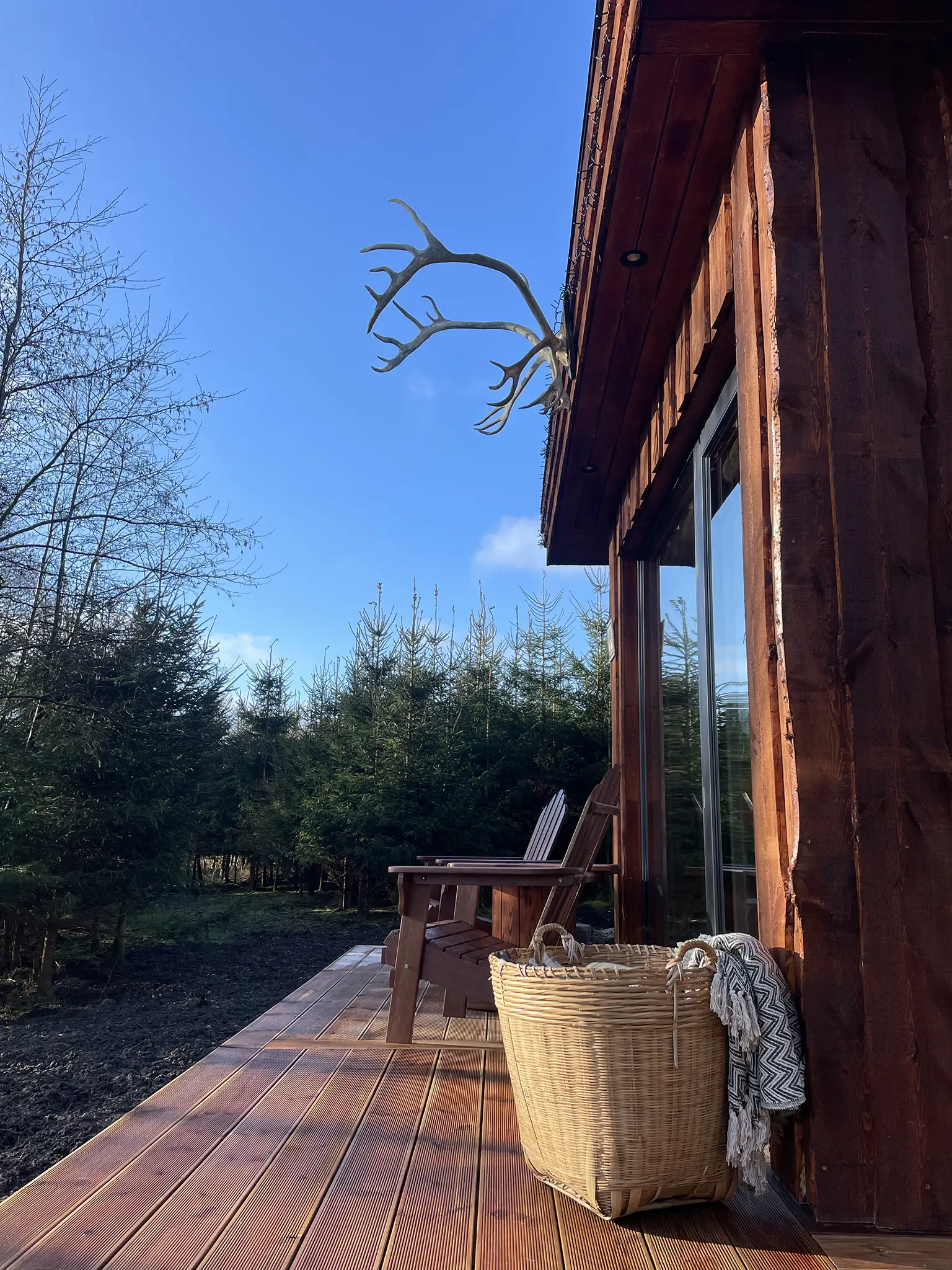 - Træterrasser rundt om hytten med behagelige stole og bord