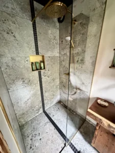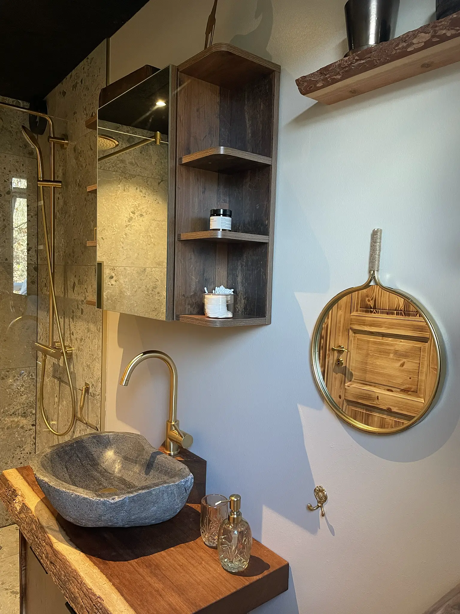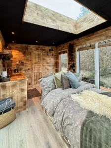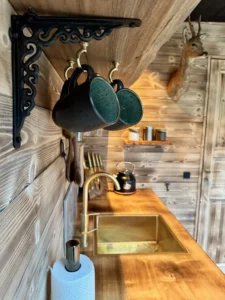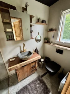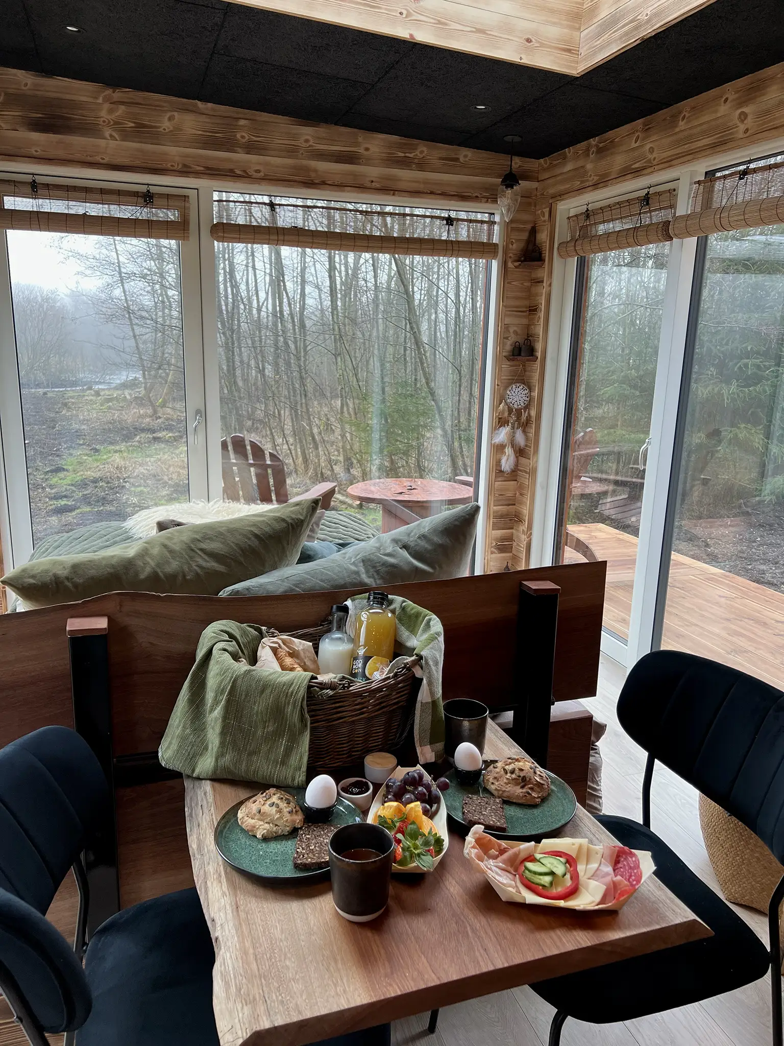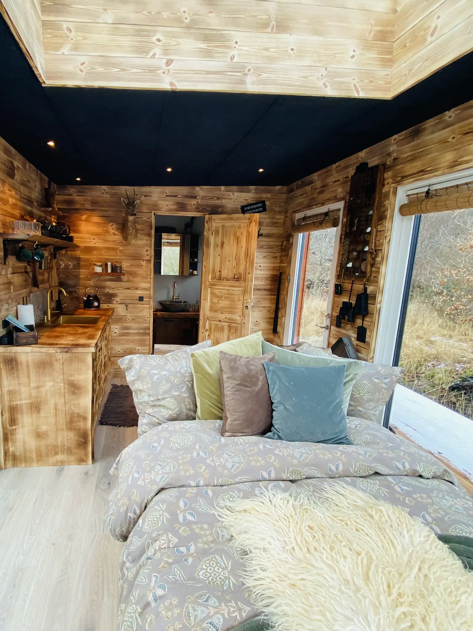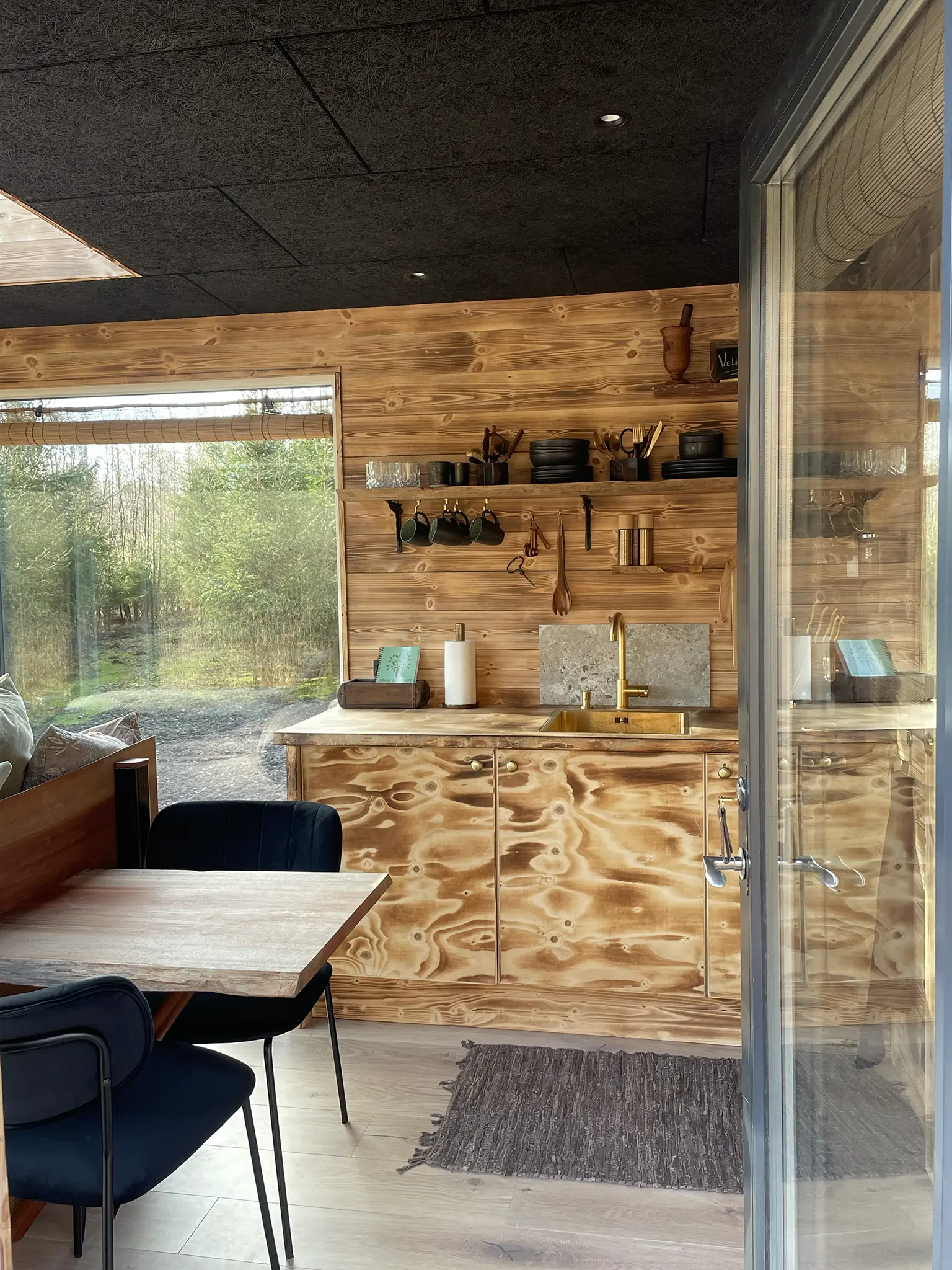 SkovPerlen har et lækkert badeværelse, tekøkken med køleskab og combiovn, en Wellpure-seng og dejlige moskusdyner og puder.