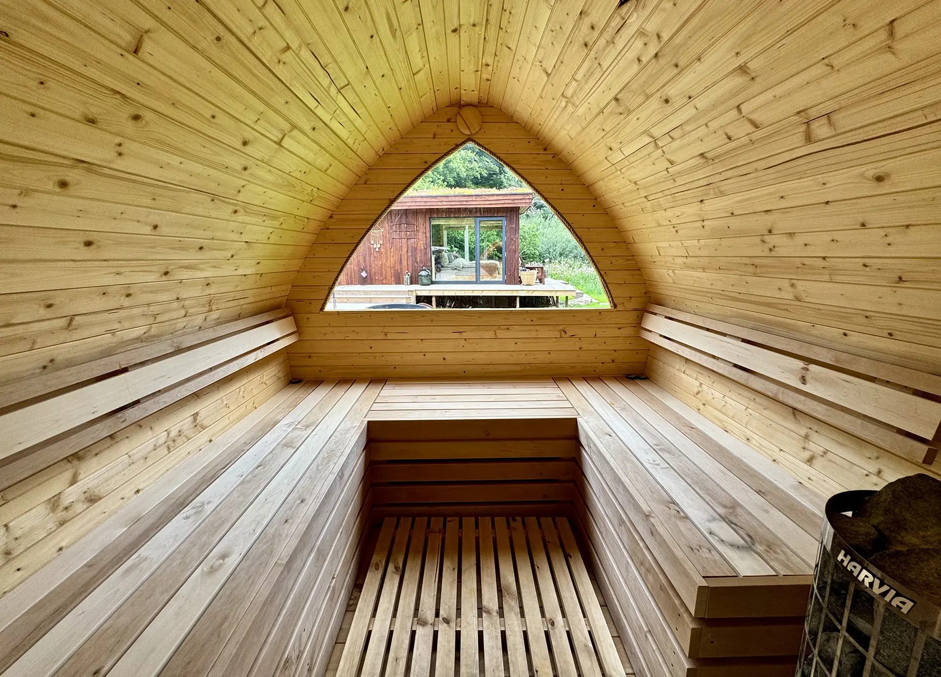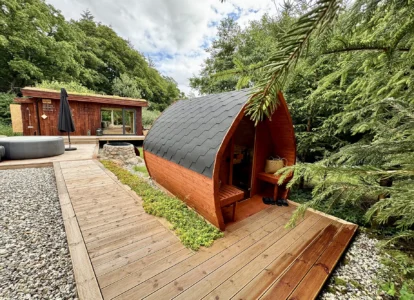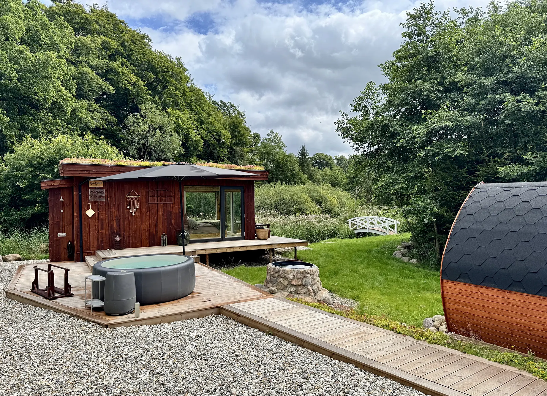 SÆRLIGT: Eget spaområde med jacuzzi-spa, sauna, udendørsbruser og koldtvandskar til rådighed under hele jeres ophold til ubegrænset brug – helt uforstyrret og inklusiv i prisen
