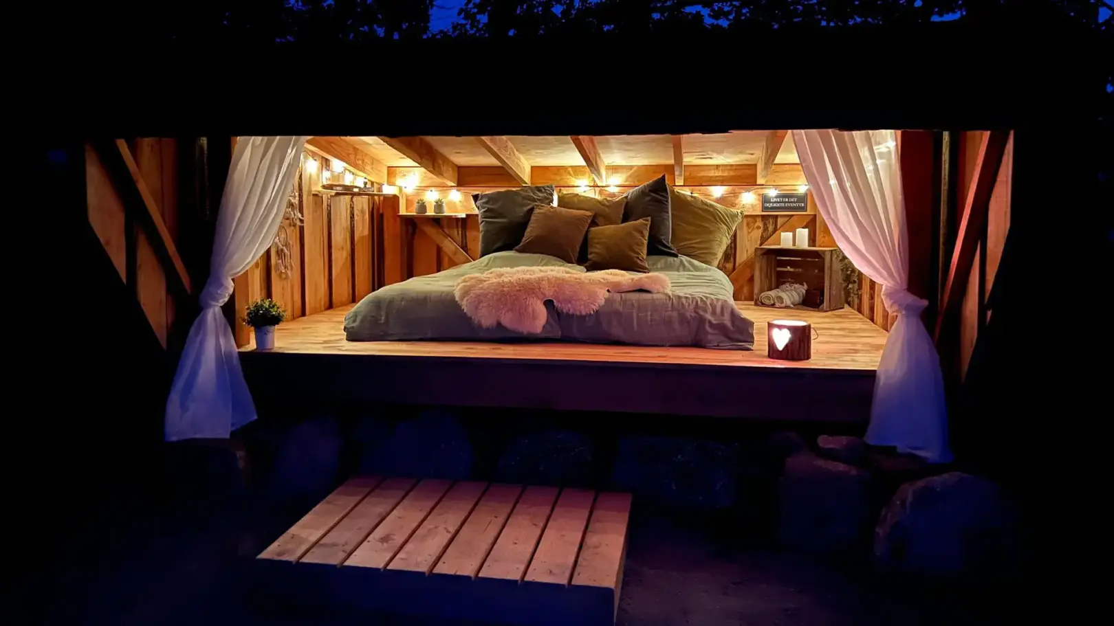 Hos Heart of Nature kan du se frem til en fantastisk luksus naturoplevelse – uden at gå på kompromis med din komfort! Alle vores shelters og hytter er indrettet med lækre madrasser, dyner puder og masser af tæpper, så I kan slappe af og bare nyde naturen.